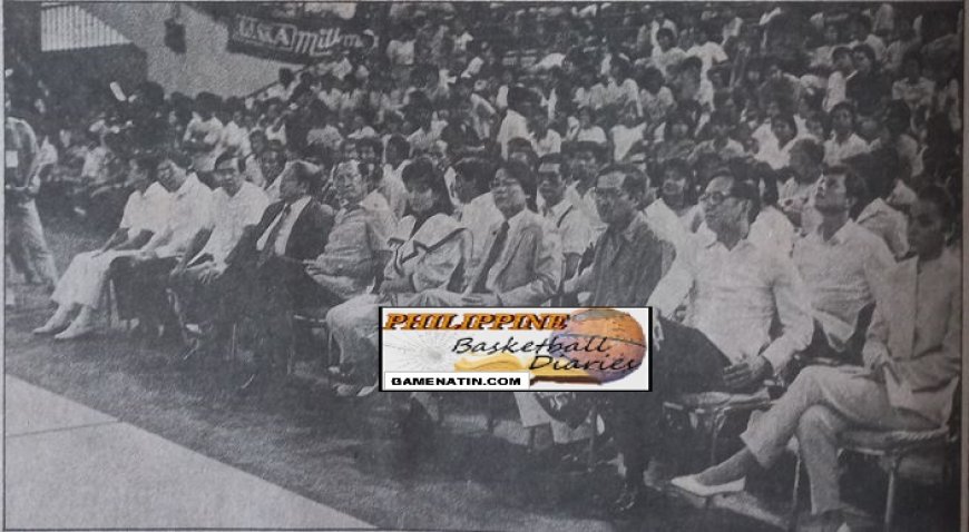 Inside the gym, the atmosphere was festive. A carnival crowd dressed in their sporty Sunday best, had seated them- selves around the tiers of ringside, lower level and bleacher seats. Popcorn, ice cream and softdrinks vendors peddled their wares animatedly among the crowd. As did sellers of the just-out PBA Annual. Over at the press box, an over-zealous guard refused entry to legitimate press people there to cover the games in a misplaced attempt to put order into. crowd control. The atmosphere was charged. Suddenly there was loud cheering and hearty applause. The President's daughter, dressed in meaningful yellow and black, paraded in, escorted by a dapper General Fidel V. Ramos, who was likewise heartily greeted by the crowd. Booming Joe Cantada started the opening ceremonies going with an intro speech that smacked of relevance. "This. is another expression of people power," he said. "The PBA will continue to thrive as long as you and the masses continue to see in us a diversion and a relief from the drudgery of everyday life." And then he stressed: "We will never allow politics to get in the way of the games," pre- empting potential booers of politically- aligned cagers in the last elections pre- vailing upon them indirectly to shut up. and behave.