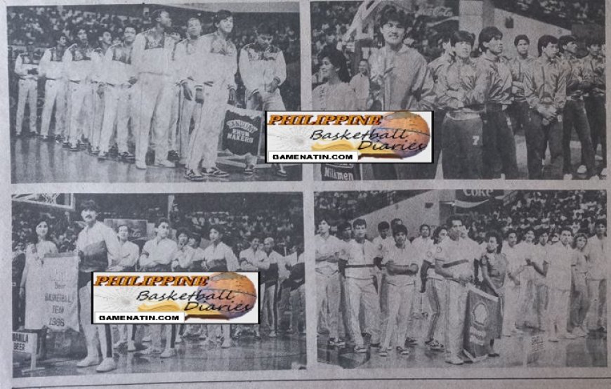 Then the parade of players began what Joe Cantada called "The Cast of Characters of the 1986 PBA". The league's newest ballclub, Alaska Milk, with pert and pretty Joey Albert as muse, paraded in while the Cainta Band played the Alaska Milk "Wala Pa Ring Tatalo Sal Alaska" jingle in the background. Close at their heels were the Manila Beermen in their golden yellow jackets and pants, led by muse, Peachy Sacasas. The loudest cheers, however, were reserved for Ginebra, who marched in with Gretchen Barretto at the helm, followed by a host of (Super) Angels and the Living Legend himself, Sonny Jaworski, in their midst. There was no booing for Jaworski, as previously feared. Instead, thunderclaps of applause and deafening cheers, plus streamers declaring fans' loyalties to the Big J staggered the senses. Tanduay came in next, a little out-of- place in the eye-dazzling parade. With- out a muse, the all-male contingent looked quite forlorn, although Tanduay man, Ed Rivera, divulged later that they had been sort of "injunned" by their muse, Kristine Garcia, who came at 5, thinking the opening ceremonies would begin that late. Shell followed suit, with Miss Philip- pines-International Sabrina Artadi as muse. Great Taste brought up the rear with the only foreign muse and two little girls bearing flowers to add more spectacle to the parade. Several cagers sported new looks and new haircuts. Steve Watson, now with Great Taste, sported a well-coiffed flat top haircut that made him look like a 30's matinee idol. Francis Arnaiz came clean-cut, sans his age-old moustache and beard. Padim Isreal had a close-cropped Robert de Niro cut from "Taxi Driver" days.