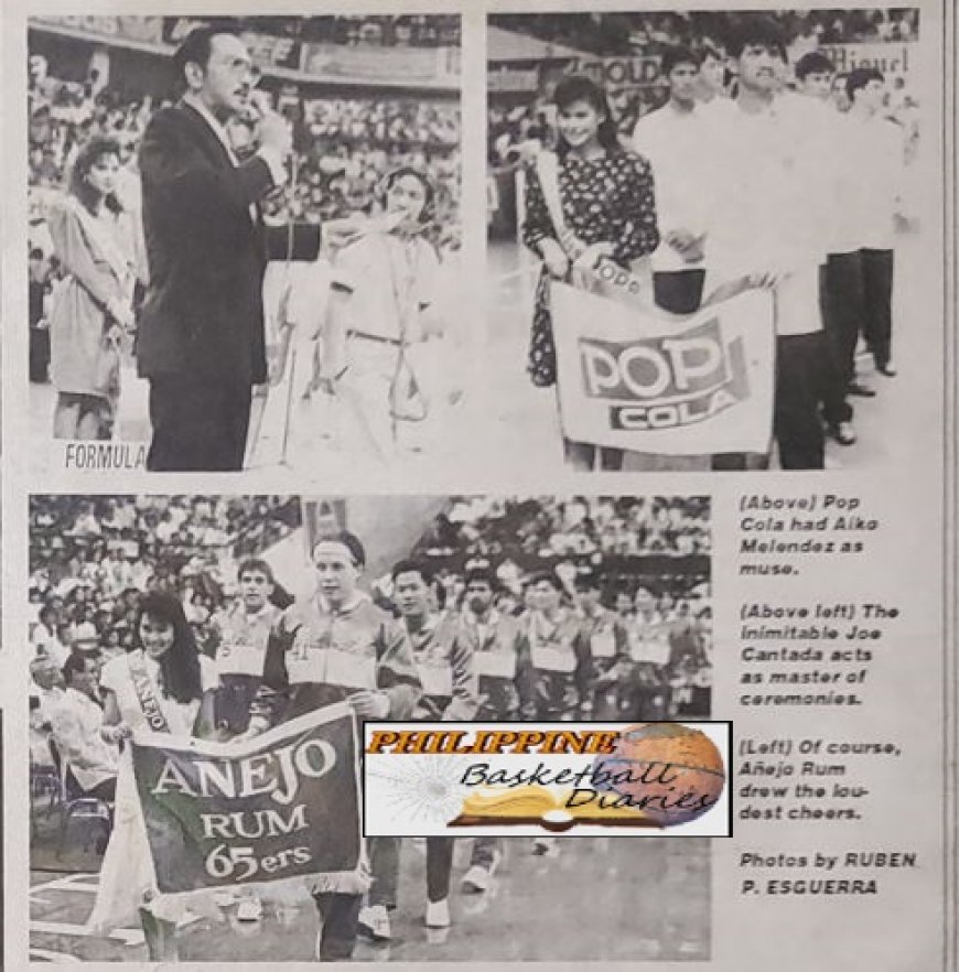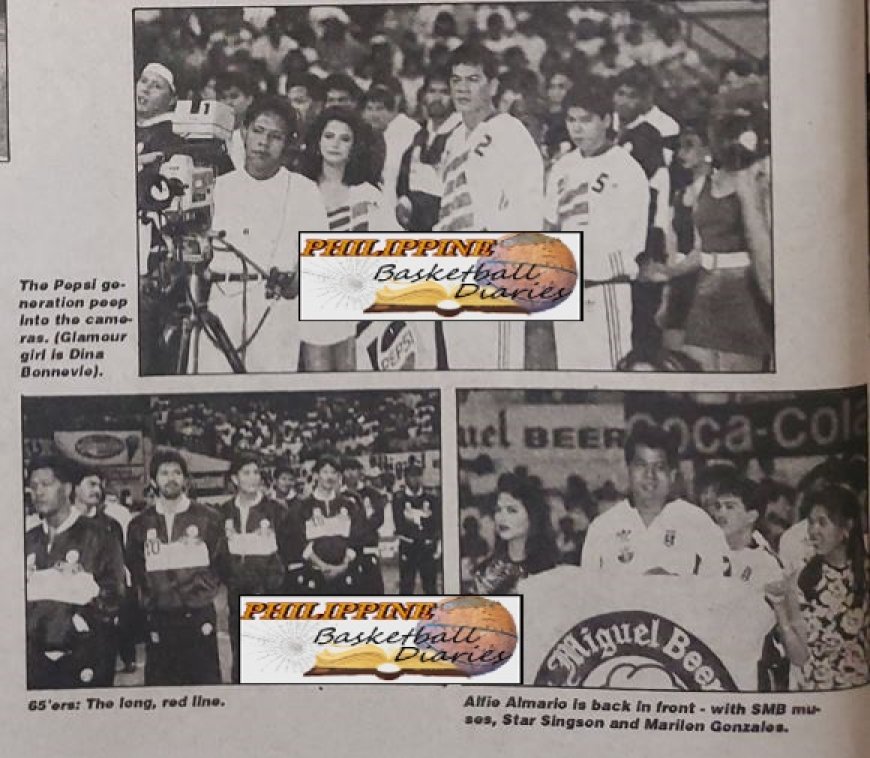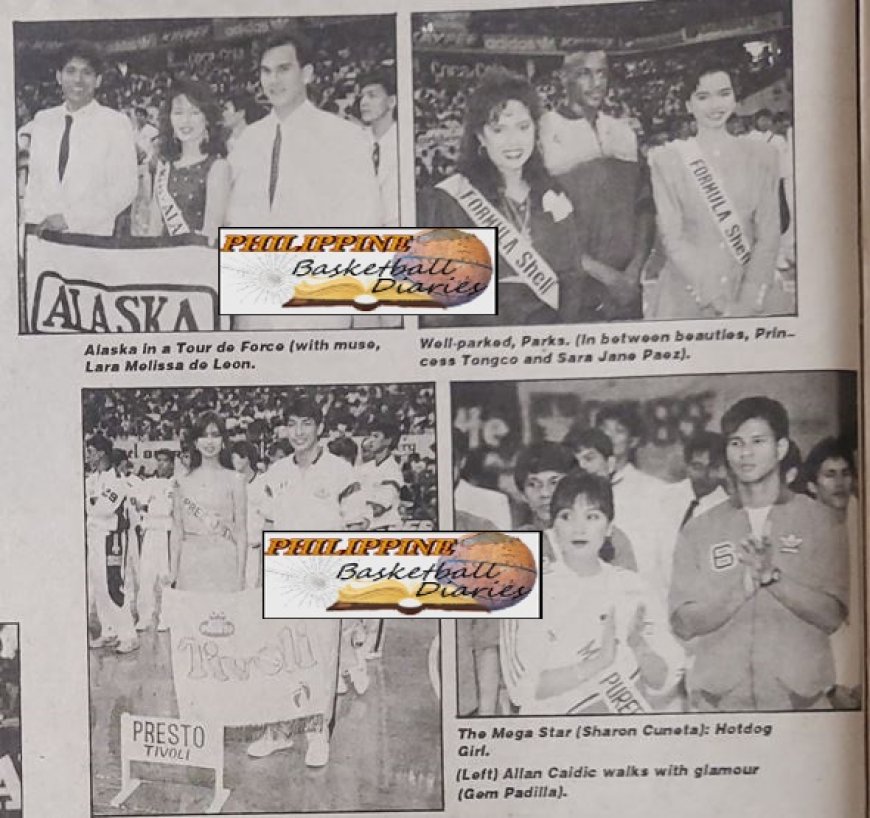 It wasn't all brawn on opening day as the inaugurals also had its share of good looks. Each team was escorted in by a bevy of lookers. The Pop Cola Sizzlers, who entered the court wearing pristine barong tagalog befit- ting their slogan 'Bilib sa Pinoy', had Regal protege Aiko Melendez as muse. Another star of the silver screen, Lara Melissa de Leon came in with the Alaska Milkmen who were dressed in elegant beige coats and ties with matching brown shoes. Crowd favorite Añejo Rum 65 had petite Monnie Hortaleza beside team captain Chito Loyzaga. For Purefoods, muse was no less than megastar herself, Sharon Cuneta, who walked beside skipper Jojo Lastimosa. Expansion franchise Pepsi Cola had dramatic actress Dina Bonnevie plus 24 other charmers who later danced to the tune of Robert Palmer's "Simply Irresistible!" Binibining Pilipinas Universe Germalina Leah Padilla was muse of the Presto Tivolis skippered by hotshot Allan Caidic.