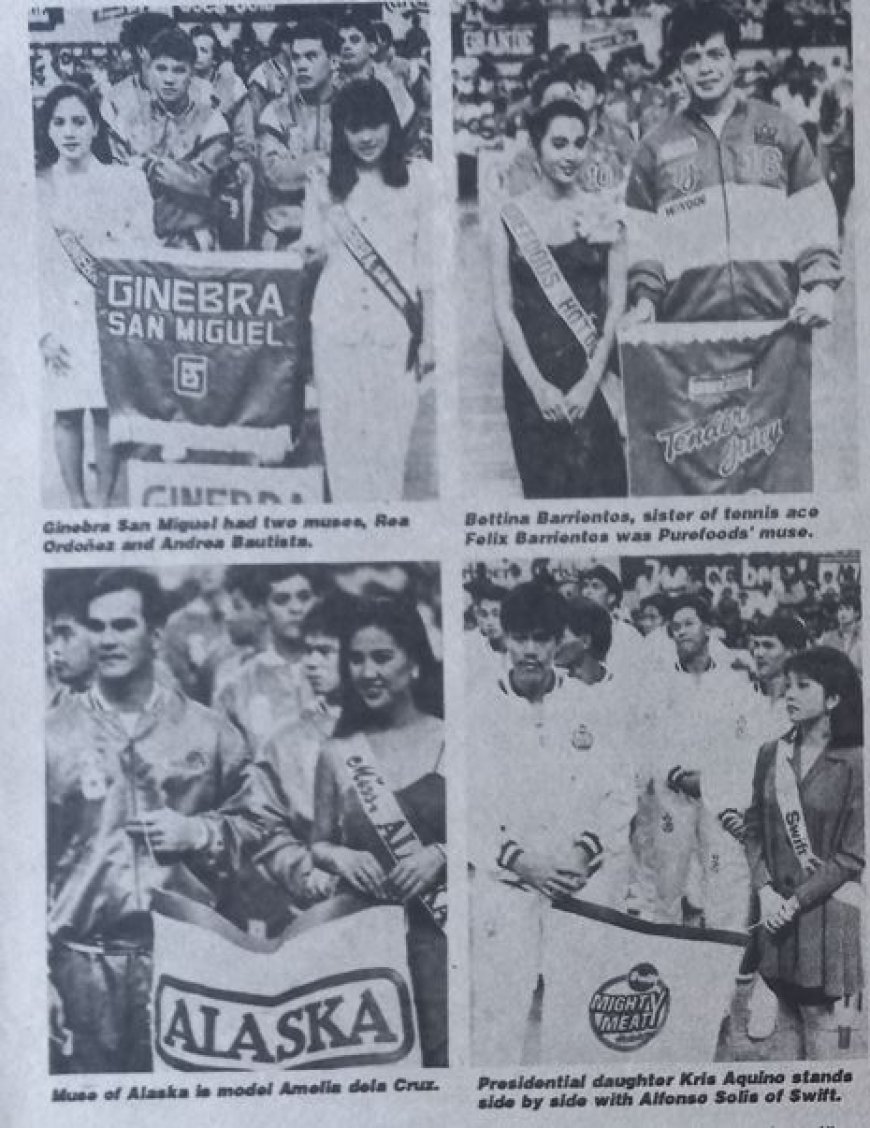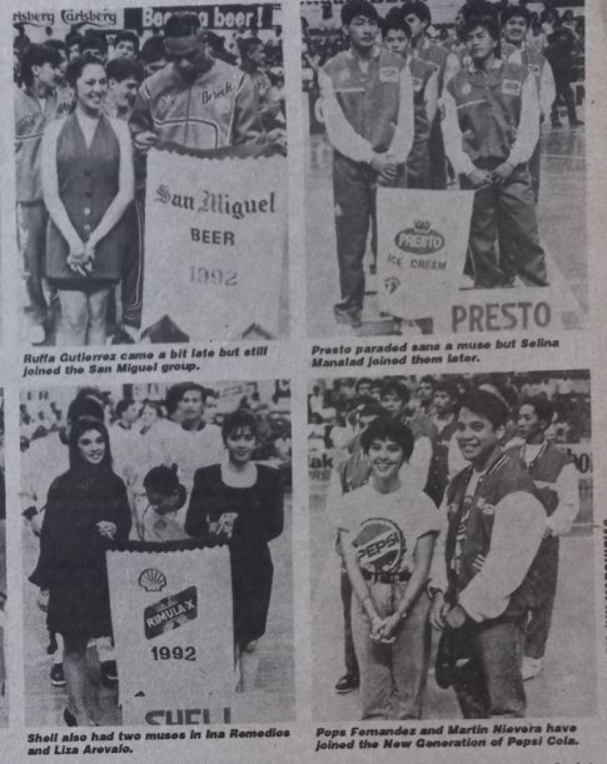 Pops Fernandez and Martin Nievera have shifted from The Real Thing' to the 'New Generation' as they are now endorsing Pepsi Cola. Thus no one was surprised when Pops came as muse for the Hotshots during the opening parade. She was escorted by her husband, of course. Aside from Pops, there were three other movie stars who acted as muses of their respective teams. For Swift Mighty Meaties it was presidential daughter Kris Aquino. San Miguel Beer had Regal Baby Ruffa Gutierrez. Ginebra had two muses Rea Ordoñez and former movie star Andrea Bautista, daughter of senatorial candidate Ramon Revilla. Presto muse was Selina Manalad, reigning Miss Maja Philippines. Alaska had Amelia dela Cruz leading the Milkmen. Shell had two muses in Ina Remedios and Liza Arevalo. Purefoods' muse was Bettina Barrientos, sister of Filipino tennis sensation Felix Barrientos. All but two of the muses arrived on time and marched alongside their teams during the parade. However, Gutierrez and Manalad arrived quite late and had to scamper to be with their teams while the invocation was going on.
