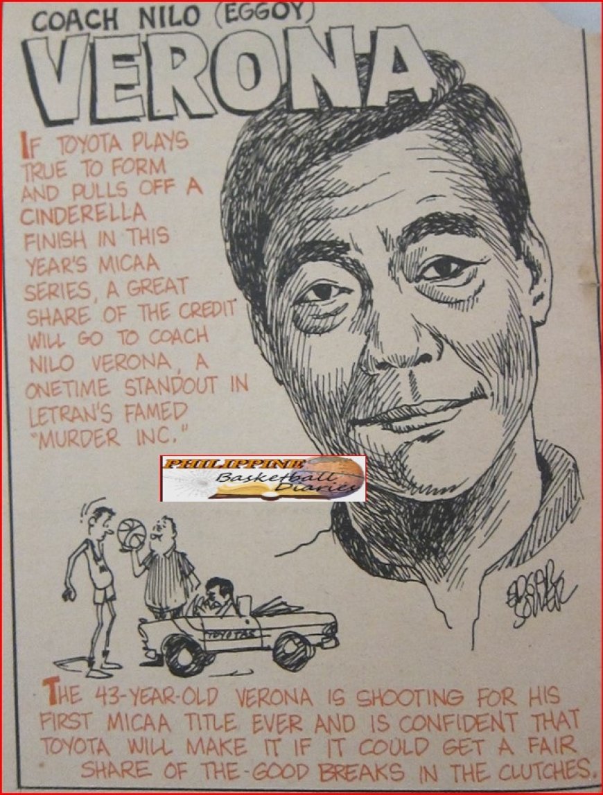 Ironically, while Nilo Verona (then named Claustro, a monicker he got while studying at the Ateneo) made a name as a member of the 1950 NCAA champion team of Letran (together with Lauro Mumar, Herminio Astorga, Ricardo Panis, Chemari Iglesias, Cesar Sequera, Cui, et al) he never finished a course at Muralla. It was several years later, after his active playing years that he was able to complete his. BS Commerce course at the University of San Carlos in Cebu. 'I was assistant manager of the Yellow Taxi then, and I made use of my spare time properly by going back to school.' Actually, Nilo played with the Muralla hoopsters for three years (1950-53). Earlier he joined the Terminal team in the MICAA where he made it to the MICAA Selection on his first year. He was not able to join the team though when it played abroad. What does Nilo think of the pro league? Does it affect amateur caging? 'Only to the extent that the PBA will not get our amateur stars' he said, admitting that we will not be able to form a strong national team.