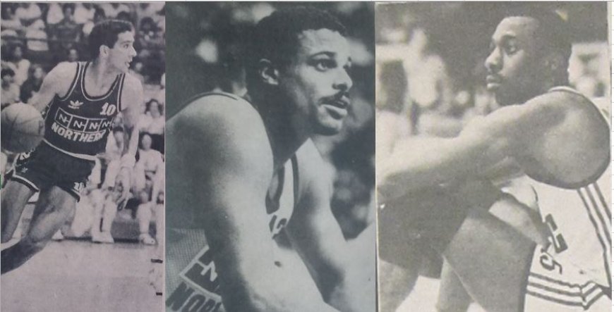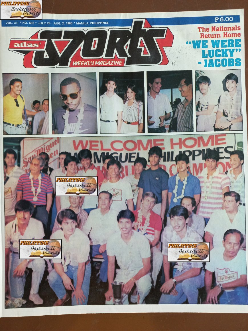 The NCC national team, carrying the San Miguel Beer colors, was given a warm welcome at the Manila International Airport. The national team went unbeaten in the tournament and defeated the United States Golden Eagles selection, 108-100, in overtime, to win the title. Photo shows the team with Coach Ron Jacobs, assistant coach Pilo Pumaren and team manager Henry Cojuangco.