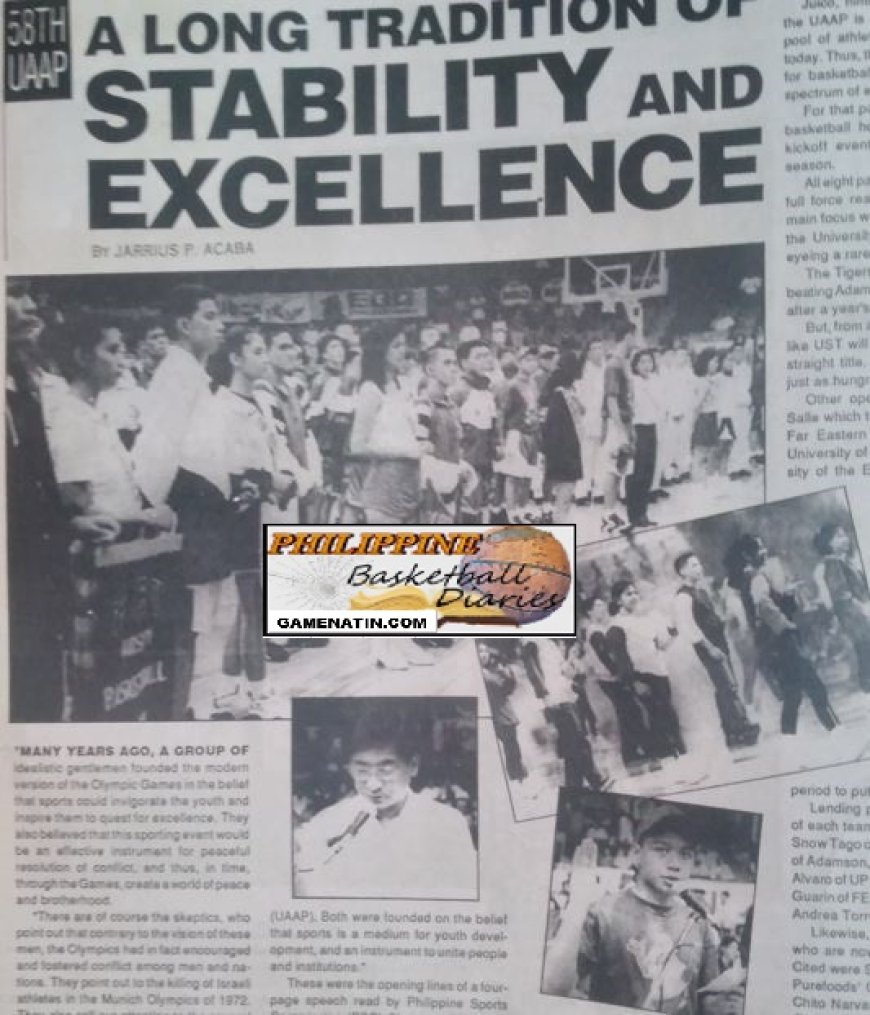 Note : "There are of course the skeptics, who point out that contrary to the vision of these men, the Olympics had in fact encouraged and fostered conflict among men and na- tions. They point out to the killing of Israeli athletes in the Munich Olympics of 1972. They also call our attention to the several boycotts of Olympic Games for political reasons. But the Olympics Games have endured and will continue to endure as long as we long and fight for the cause of peace. And as long as men continue to hold on to their idealism. "It is not difficult to notice a parallelism between the Olympics and the University Athletic Association of the Philippines. (UAAP). Both were founded on the belief that sports is a medium for youth devel- opment, and an instrument to unite people and institutions." These were the opening lines of a four- page speech read by Philippine Sports Commission (PSC) Chairman Philip Ella Juico during the opening rites of the 58th edition of the UAAP at the Araneta Coliseum last Saturday. And Juico was right in comparing the Olympic body with the UAAP in terms of diversity of composition but oneness in objective.